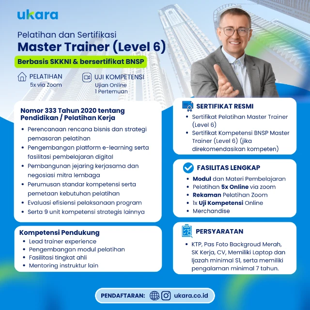 - Sertifikat Kompetensi BNSP Instruktur Master (Master Trainer) (jika lulus ujikom)